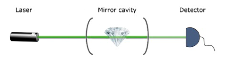 以前沒有采用單一綠光做測試的原因在于綠光輸入與輸出的功率對比很微弱。而隨著腔體技術(shù)的成熟,我們加入一個(gè)腔后(如下圖),綠光被鉆石吸收的更多,能夠測得的功率變化就更容易實(shí)現(xiàn)一些。