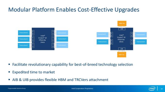 Intel將提供Stratix 10 TX的不同版本,將多達(dá)五個(gè)58 Gbps收發(fā)器模塊與FPGA集成在一起,其中包括60萬(wàn)至280萬(wàn)個(gè)可編程邏輯元件。雖然中央FPGA采用英特爾的14納米制程技術(shù),但收發(fā)器將建立在臺(tái)積電16FF工藝的基礎(chǔ)上,這是由于Altera使用臺(tái)積電的模擬硬件的歷史。英特爾表示,如果需要的話,收發(fā)器可以降至1Gbps,從而實(shí)現(xiàn)與現(xiàn)有網(wǎng)絡(luò)的向后兼容。這些收發(fā)器將在2018年3月首次展示,最終推向市場(chǎng)。