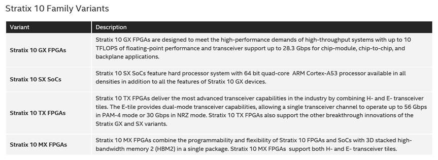 英特爾提供所有英特爾Stratix 10 FPGA系列變體:英特爾Stratix 10 GX FPGA(帶有28G收發(fā)器),英特爾Stratix 10 SX FPGA(帶有嵌入式四核ARM處理器),英特爾Stratix 10 MX FPGA(帶有HBM內(nèi)存)和Stratix 10 TX FPGA(帶有58G收發(fā)器)。