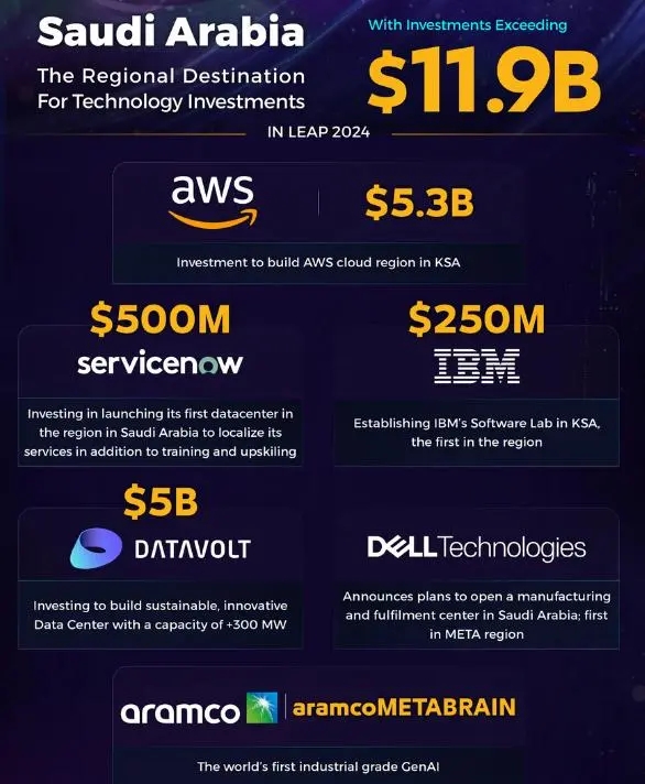 僅在第一天,亞馬遜AWS等多家公司就宣布將向主辦國沙特阿拉伯總共投資超100億美元建設(shè)數(shù)據(jù)中心,以支持科技初創(chuàng)企業(yè)在當(dāng)?shù)氐陌l(fā)展。