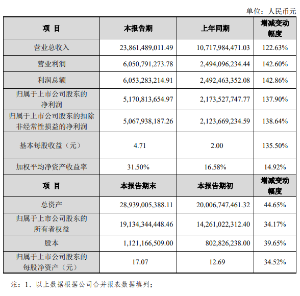 報(bào)告期末,公司總資產(chǎn)為 2,893,900.54 萬(wàn)元,較期初增長(zhǎng) 44.65%;歸屬于上市公司股東的所有者權(quán)益為 1,913,434.44 萬(wàn)元,較期初增長(zhǎng) 34.17%;歸屬于上市公司股東的每股凈資產(chǎn)為 17.07 元,較期初增長(zhǎng) 34.52%。