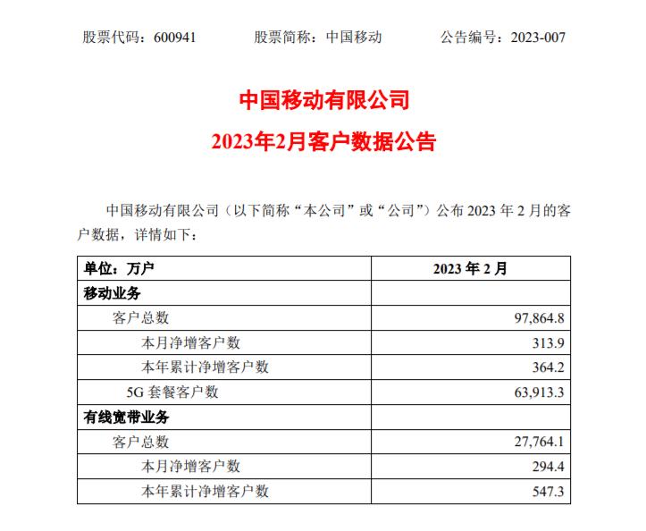 ICC訊 20日晚,中國移動公布2023年2月份運(yùn)營數(shù)據(jù),當(dāng)月,中國移動移動客戶數(shù)凈增313.9萬戶,用戶總數(shù)達(dá)到9.78648億戶。
