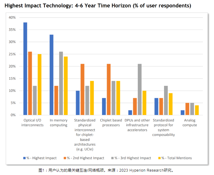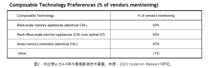 展望未來系統(tǒng)需求,用戶和供應(yīng)商在幾個關(guān)鍵點上達成共識。超過75%受訪者強調(diào)資源分散和可組合系統(tǒng)必要性,以優(yōu)化特定工作負載。用戶還將系統(tǒng)擴展和網(wǎng)絡(luò)吞吐量提升作為重中之重。供應(yīng)商方面認為光互連和內(nèi)存計算是對未來體系結(jié)構(gòu)影響最大的技術(shù)。圖2顯示供應(yīng)商看法,未來4-6年內(nèi)最高影響技術(shù)以光互連為主,高達30%選票,內(nèi)存計算也很重要。