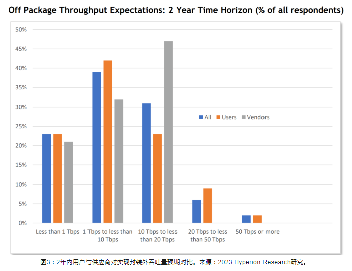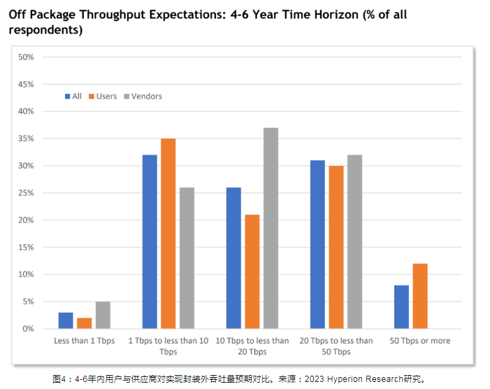 盡管用戶和供應(yīng)商都認可光互連前景,但對其成熟時間預(yù)期有差異。圖3和圖4比較用戶和供應(yīng)商對2年內(nèi)和4-6年內(nèi)實現(xiàn)的封裝外吞吐量預(yù)期。用戶預(yù)計4-6年內(nèi)實現(xiàn)50 Tbps鏈接,而大多數(shù)供應(yīng)商認為20-50 Tbps仍需5年以上。但兩者都看好光互連在不久后將迅速突破10 Tbps,相比當(dāng)前電互連提升10倍。要實現(xiàn)這一增益,標(biāo)準(zhǔn)和生態(tài)必須進化支持光集成。Ayar Labs通過提供處理器封裝內(nèi)的光輸入輸出“chiplets”,旨在加速商業(yè)采用。通過互操作光組件避免專有接口,平滑光互連發(fā)展之路。