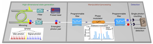 基于糾纏光子的光量子系統(tǒng)是解決現(xiàn)代量子物理和量子信息科學(xué)中諸多問題的核心基礎(chǔ)。隨著量子信息研究的深入,除多光子糾纏外,高維量子態(tài)(qudit)因其攜載信息能力遠(yuǎn)高于量子比特(qubit)的優(yōu)勢,引起了人們廣泛關(guān)注,已成為量子機理深層次研究、提升量子通信協(xié)議魯棒性與速率、以及實現(xiàn)更高效量子計算等的關(guān)鍵手段。