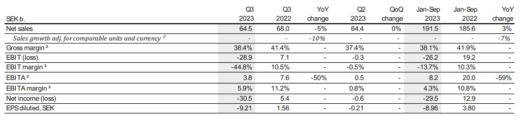 2023年第三季度愛立信銷售收入為645億瑞典克朗,去年同期為680億瑞典克朗,同比下滑5%。上個(gè)季度為644億瑞典克朗,環(huán)比持平。毛利率為38.4%,去年同期為41.4%。第三季度凈虧損305億瑞典克朗,去年同期凈收入54億瑞典克朗;上個(gè)季度凈虧損6億瑞典克朗。