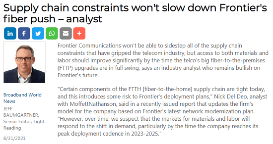 ICC訊(編譯:Nina)一位仍然看好Frontier未來的行業(yè)分析師表示,Frontier Communications將無法避開困擾電信行業(yè)的所有供應(yīng)鏈限制,但等到該電信公司的大型光纖到戶(FTTP)部署全面開展時(shí),材料和勞動(dòng)力短缺的情況應(yīng)該會(huì)顯著改善。