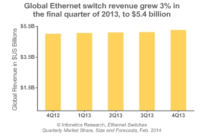 *2013年四季度全球以太網(wǎng)交換機(jī)收入環(huán)比上漲3%,同比增長3%,達(dá)到54億美元;