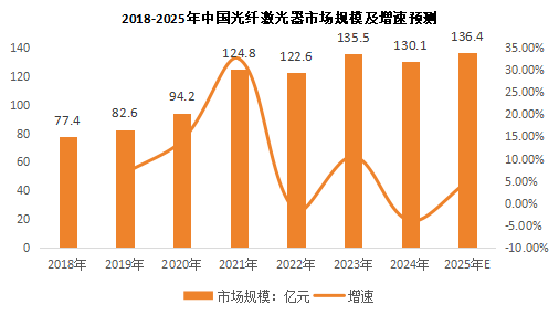 相關(guān)數(shù)據(jù)顯示,我國光纖激光器市場規(guī)模從 2019 年的 82.6 億元增長至 2024年的130.1億元,復(fù)合增長率超過12%。此外,隨著國內(nèi)光纖激光器廠商綜合實力增強,國產(chǎn)光纖激光器功率和性能逐步提高,光纖激光器國產(chǎn)替代加速,國產(chǎn)光纖激光器市場占比已達(dá) 86.2%。