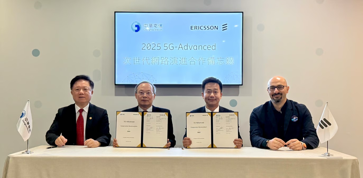 中華電信首席技術(shù)官兼執(zhí)行副總裁黃志雄與愛(ài)立信臺(tái)灣地區(qū)總裁周永明在2025年世界移動(dòng)通信大會(huì)上簽署了諒解備忘錄。中華電信董事長(zhǎng)錢立新、愛(ài)立信東北亞區(qū)總裁兼高級(jí)副總裁Chafic Nassif等人作見(jiàn)證。