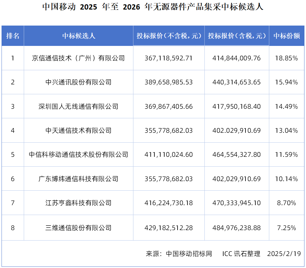 ICC訊 日前,中國(guó)移動(dòng)于官網(wǎng)公示了2025年至2026年無(wú)源器件產(chǎn)品集中采購(gòu)項(xiàng)目的中標(biāo)候選人。本次集采共吸引京信通信、中興通訊等8廠商入選中標(biāo),總中標(biāo)金額(含稅)超29.5億元。