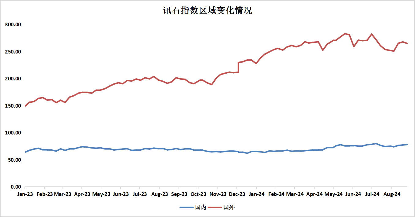 按地區(qū)劃分,截止到8月30日,ICC所統(tǒng)計(jì)的國內(nèi)通信指數(shù)為78.07,環(huán)比增長4.98%。國外通信指數(shù)為264.96,較上月增長2.97%。整體來看,國內(nèi)通信股指變動(dòng)呈現(xiàn)增長趨勢,國外股指在波動(dòng)中趨于平緩。