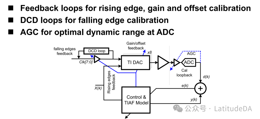 此外,還采用了基于自適應(yīng)濾波器的校準(zhǔn)方法,以解決整個(gè) DAC 片的定時(shí)、增益和偏移失配問(wèn)題(圖 11)。該技術(shù)采用反饋回路來(lái)感測(cè)和校正損傷,自適應(yīng)濾波器對(duì)模擬電路行為進(jìn)行建模。上升沿時(shí)序、增益和偏移通過(guò)專用反饋環(huán)路進(jìn)行校準(zhǔn),而下降沿則通過(guò)占空比失真(DCD)環(huán)路進(jìn)行校準(zhǔn)。自動(dòng)增益控制 (AGC) 塊可優(yōu)化 ADC 輸入端的動(dòng)態(tài)范圍。