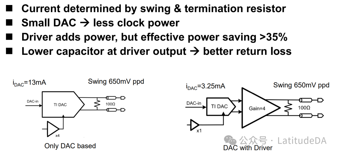 DAC 和驅(qū)動(dòng)器架構(gòu)為了在最大限度降低功耗的同時(shí)實(shí)現(xiàn)所需的高帶寬,DAC 采用了低擺幅輸出來(lái)驅(qū)動(dòng)高帶寬輸出驅(qū)動(dòng)器(圖 12-13)。與具有較高擺幅的純 DAC 架構(gòu)相比,這種方法可節(jié)省 35% 以上的功耗。驅(qū)動(dòng)器輸出電容通過(guò) DAC 和驅(qū)動(dòng)器之間的電感峰值以及在高電容節(jié)點(diǎn)上使用 T 型線圈等技術(shù)來(lái)降低。