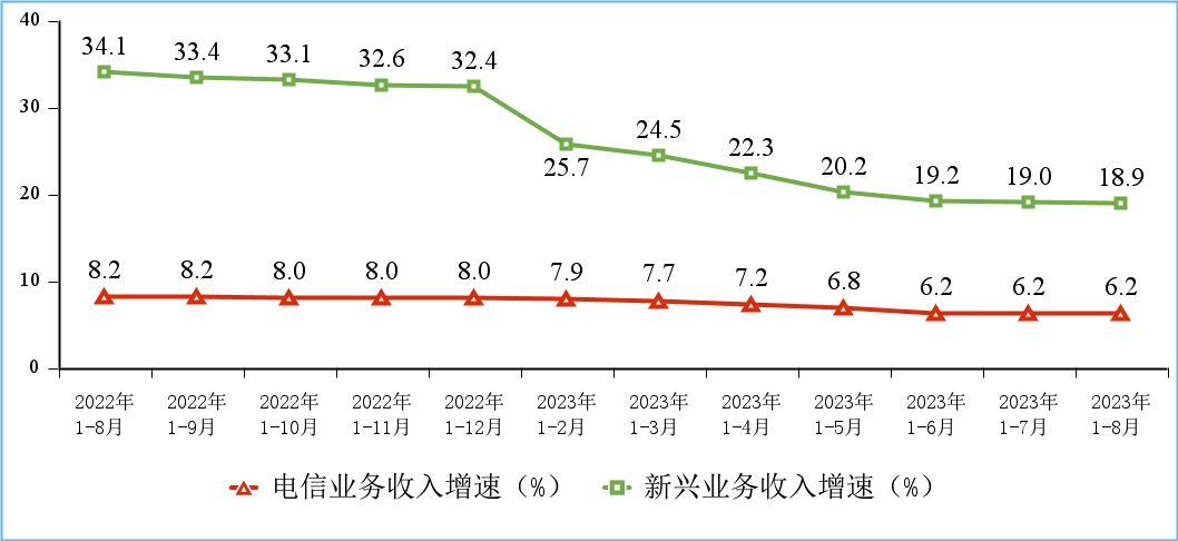 語音業(yè)務(wù)收入持續(xù)回落。1-8月份,三家基礎(chǔ)電信企業(yè)完成固定語音和移動語音業(yè)務(wù)收入126.4億元和759.2億元,同比分別下降9%和1.9%,在電信業(yè)務(wù)收入中總占比7.8%,占比同比回落0.6個百分點。