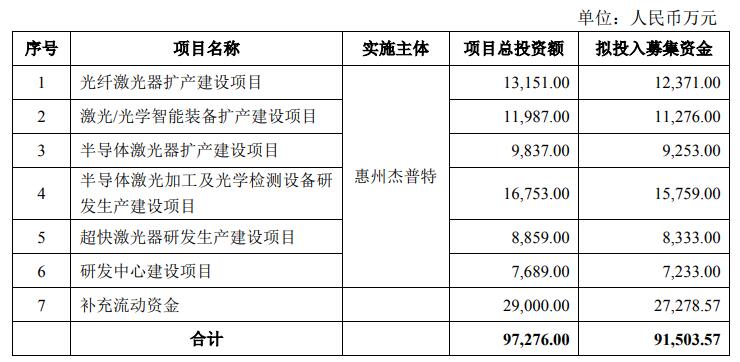 公告指出,本次公開(kāi)發(fā)行募集資金總額扣除發(fā)行費(fèi)用后,投入光纖激光器擴(kuò)產(chǎn)建設(shè)項(xiàng)目、激光/光學(xué)智能裝備擴(kuò)產(chǎn)建設(shè)項(xiàng)目、半導(dǎo)體激光器擴(kuò)產(chǎn)建設(shè)項(xiàng)目等,詳細(xì)項(xiàng)目清單如下表所示: