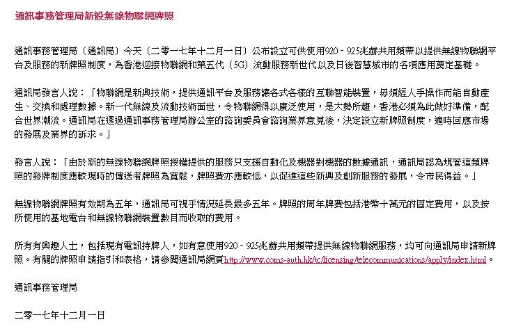 通訊局指出,收集意見的主要范疇為頻率規(guī)劃、將提供的服務(wù)及應(yīng)用、頻率需求和上限、設(shè)備供應(yīng)和指配頻譜的時(shí)間表、頻譜共用、服務(wù)水平要求和網(wǎng)絡(luò)舖設(shè)計(jì)劃、技術(shù)測(cè)試。