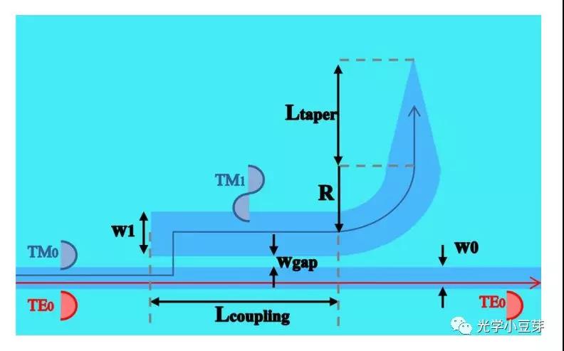 利用bi-level taper, 使得TM0模式轉(zhuǎn)換為TE1模式,進(jìn)而利用不對(duì)稱的定向耦合器,使得TE1模式轉(zhuǎn)變?yōu)門E0模式。典型的結(jié)構(gòu)如下圖所示,