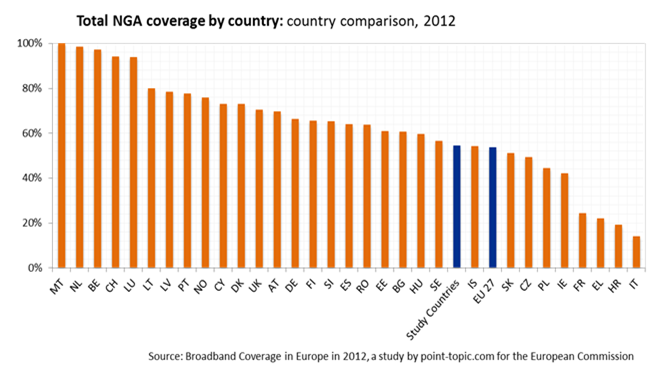 在2012年年底,馬耳他、荷蘭、比利時(shí)、瑞士和盧森堡 NGA覆蓋率已經(jīng)超過90%。然而,在法國、希臘、克羅地亞和意大利NGA覆蓋率則不到25%。