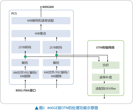 在第一階段的工作,ITU-T SG15 Q11已經(jīng)達(dá)成了諸多共識。在承載IEEE802.3規(guī)范的800GE客戶業(yè)務(wù)方面,確定了ODUflex(800G)速率以及800GE到OTN映射的參考點,從800GE以太網(wǎng)接口恢復(fù)的2條257B格式的數(shù)據(jù)流,按照257B的粒度進(jìn)行交織形成一條數(shù)據(jù)流。同時為了解決257B帶來的對齊和MTTFPA(mean time to false packet acceptance)問題,將ODUflex 4×3808行凈荷劃分為整數(shù)倍的257B塊和38bit的填充,其中32bit用于承載CRC32完成相關(guān)錯誤標(biāo)記功能。為了簡化ODUflex和以太接口時鐘的倍頻關(guān)系,還需要對該條257B數(shù)據(jù)流進(jìn)行速率補償,以彌補在800GE以太網(wǎng)處理中刪除的AM速率。對比400GE而言,為了節(jié)省傳輸帶寬,并拉近以太業(yè)務(wù)速率和OTN速率之間的差距,加大以太業(yè)務(wù)和OTN速率使用相同模塊的可能,800GE到OTN映射參考點由66B碼流變更為257B碼流。從800GE PMA接口到OTN傳輸網(wǎng)的處理功能如圖2所示。