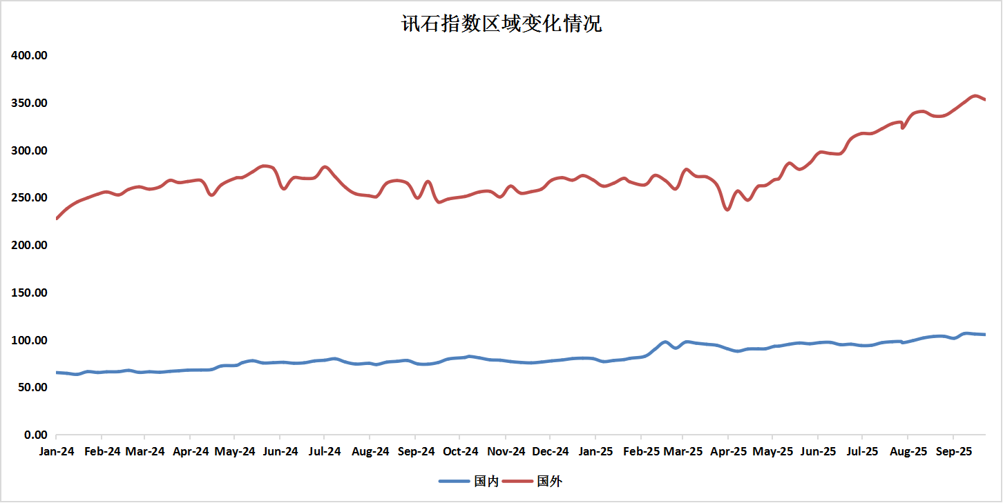 按地區(qū)劃分,截止到9月26日,ICC所統(tǒng)計(jì)的國內(nèi)通信指數(shù)為105.45,環(huán)比增長1.75%。國內(nèi)指數(shù)在平緩中呈現(xiàn)小幅增長趨勢。國外通信指數(shù)為353.34,較上月增長5.09%。國外股指在波折中,呈現(xiàn)向上增長的趨勢,增長趨勢放緩。