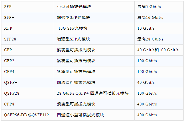 結果,全球各地的數據中心和運營商基礎設施上的數據通信量出現大規(guī)模增長,而這些基礎設施也不斷發(fā)展以支持目前和未來的流量需求。行業(yè)固有的挑戰(zhàn)自然也改變了技術的演變和發(fā)展過程。因此,網絡設備的設計考慮到諸多重要方面,如設備大小、功耗和成本等。有個因素直接影響到了這三個方面,即網絡設備內所使用的光接口。這些可插拔模塊因各自傳輸和接收數據的速率而各不相同。光收發(fā)器也從SFP發(fā)展到了QSFP-DD。下表描述了每種收發(fā)器及各自的工作速率: