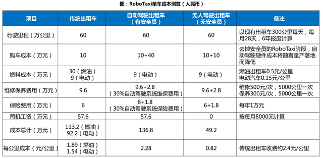 按照東吳證券研究所出具的《軟件定義汽車(chē),RoboTaxi前瞻》研究報(bào)告,一輛購(gòu)車(chē)成本20萬(wàn)元的無(wú)人出租車(chē),在無(wú)司機(jī)無(wú)安全員的運(yùn)營(yíng)模式下,其綜合每公里運(yùn)營(yíng)成本僅為0.82元,為傳統(tǒng)燃油出租車(chē)的43%。