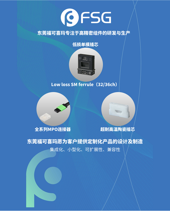 會場特設(shè)展位,東莞福可喜瑪通訊科技有限公司(FSG)首次推出業(yè)內(nèi)領(lǐng)先,使用特殊材料實(shí)現(xiàn)超耐高溫插芯,并攜全新36/32通道單模低損插芯(Low loss SM ferrule)和全系列MPO散件亮相展位號A3,??上铂?/a>愿為客戶提供全套定制化產(chǎn)品的解決方案,敬請前往展臺參觀交流!