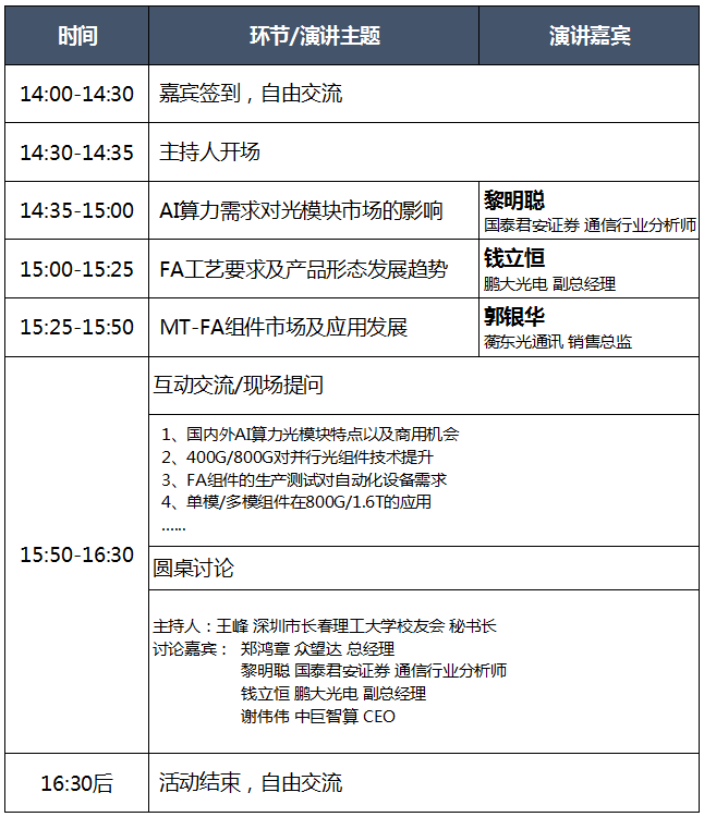 由訊石光通訊網(wǎng)與深圳市長(zhǎng)春理工大學(xué)校友會(huì)聯(lián)合主辦的ICC訊石沙龍第2期活動(dòng)將于2024年6月21日(周五)在深圳福田區(qū)本元大廈3樓舉辦,本次主題《AI算力光模塊MT-FA組件》,圍繞數(shù)據(jù)通信應(yīng)用FA光纖陣列工藝、MT-FA組件等各類無(wú)源組件的技術(shù)創(chuàng)新和熱點(diǎn)趨勢(shì)進(jìn)行深入探討。