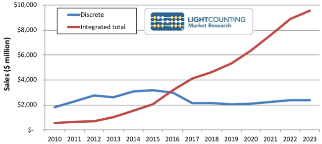 LC數(shù)據(jù)顯示,2017年,基于集成光學(xué)器件的光模塊銷售超過了40億美元。相比之下,使用分立激光器和探測器的光模塊銷售收入從2016年的30億美元下滑至2017年的20億美元左右。
