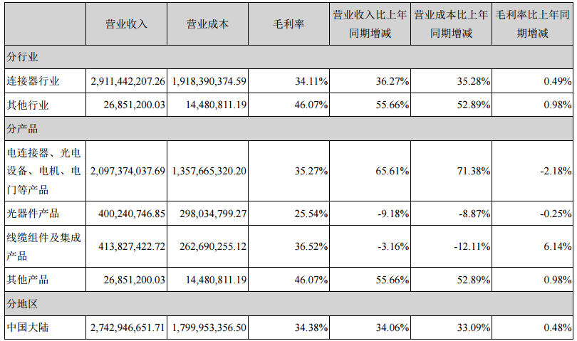 分產(chǎn)品情況看,中航光電光電設(shè)備、電連接器、電機(jī)、電門等產(chǎn)品營(yíng)收20.97億元,同比增長(zhǎng)65.61%,毛利率為35.27%;光器件產(chǎn)品營(yíng)收4億元,同比下降9.18%,毛利率為25.54%;線纜組建及集成產(chǎn)品4.14億元,同比下降3.16%,毛利率36.52%。