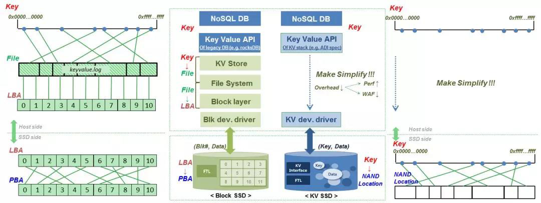 ICCSZ訊 當(dāng)前Key-Value數(shù)據(jù)庫或存儲引擎由于較高的存儲性能被廣泛的應(yīng)用于企業(yè)中,但是由于Key-Value數(shù)據(jù)庫寫入或者讀取KV鍵值對的時候, 需要完成從KV到file, file到LBA, 再從LBA到PBA的數(shù)據(jù)轉(zhuǎn)換。這種數(shù)據(jù)存取模式在機械硬盤上并沒有表現(xiàn)出太多的劣勢,但是隨著固態(tài)硬盤應(yīng)用地越來越廣泛,存儲速度越來越快,這種數(shù)據(jù)轉(zhuǎn)換所消耗的資源也越來越多,在某些情況下就會變成整個系統(tǒng)的性能瓶頸。