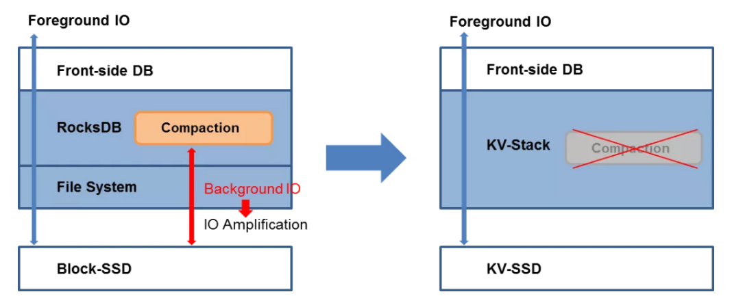首先,KV數(shù)據(jù)庫從KV SSD中讀寫數(shù)據(jù)時可以調(diào)用KV SSD提供的KV接口,將KV的讀寫請求直接轉(zhuǎn)換為對PBA的請求,省去了從key到file,再從file到LBA的轉(zhuǎn)換,簡化了數(shù)據(jù)讀寫的流程,不但提高了數(shù)據(jù)讀寫的效率,還大大減少了主機端CPU和內(nèi)存的消耗。其次,像RocksDB這樣的KV存儲引擎采用的是LSM Tree的方式來分層存儲數(shù)據(jù),對記錄的更改不是在系統(tǒng)中找到舊的數(shù)據(jù)進(jìn)行修改,而是直接將新的記錄以Append的方式寫入到內(nèi)存中,然后再flush到數(shù)據(jù)庫的第一層。每層的數(shù)據(jù)寫到一定容量之后就會觸發(fā)compaction操作,將該層的一些文件里的key-value重新排序,去除舊的數(shù)據(jù)記錄,融合成新的文件寫入到下一層。這種機制產(chǎn)生了很多Background IO,消耗了一定的SSD帶寬,不但影響了系統(tǒng)的性能,還使得RocksDB在運行時有著高達(dá)10倍的寫放大。而KV SSD提供了原生的KV接口,RocksDB可以將新的數(shù)據(jù)記錄直接寫入到SSD中,不需要再進(jìn)行反復(fù)的compaction操作,從而將RocksDB的寫放大減小到了1,而NAND本身就不支持覆蓋寫入的特性使得SSD端的寫放大并沒有顯著增加,所以整體來看,KV SSD降低整個系統(tǒng)寫入放大的效果還是很明顯的。