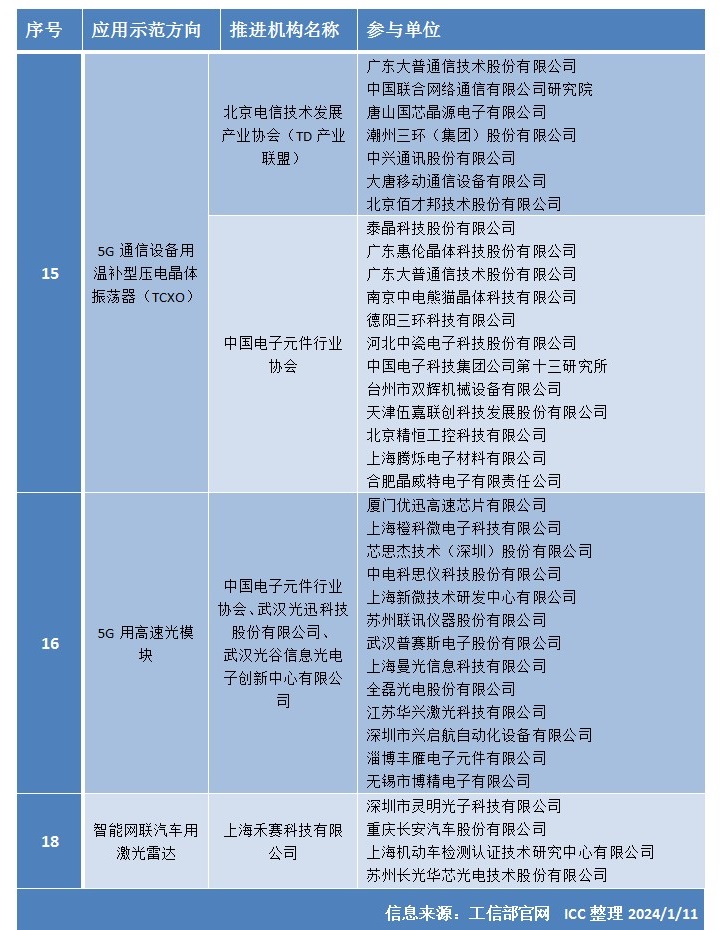 通訊作為發(fā)揮產(chǎn)業(yè)鏈創(chuàng)新協(xié)作的重要環(huán)節(jié),本輪應(yīng)用示范工作包含:5G通信設(shè)備用溫補(bǔ)型壓電晶體振蕩器(TCXO)、5G用高速光模塊、智能網(wǎng)聯(lián)汽車用激光雷達(dá)三大方向,以下為三大方向具體的推進(jìn)機(jī)構(gòu)及參與單位。
