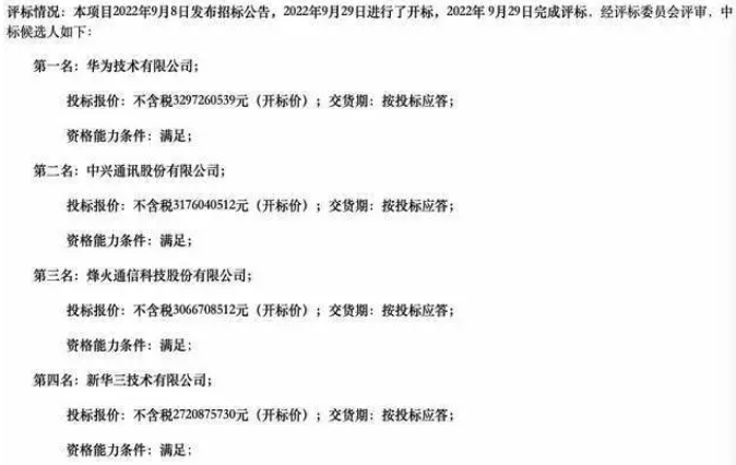 該項目2022年9月8日發(fā)布招標公告,2022年9月29日進行了開標,2022年 9月29日完成評標,經評標委員會評審,華為以32.97億元的報價奪魁,中興、烽火、新華三報價分別為31.76億、30.67億、27.21億。