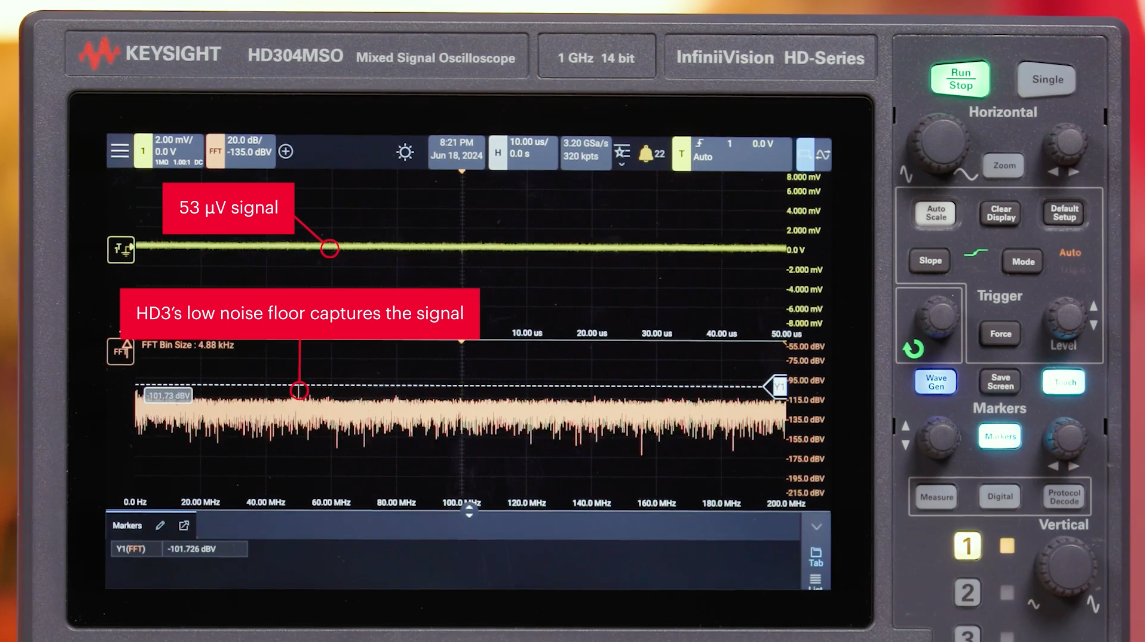 圖2:本底噪聲小于 50 μV 的示波器可捕捉到 53 μV 的微弱信號,相比之下,這樣的信號在其他通用示波器的本底噪聲中往往會被淹沒而無法被觀測到