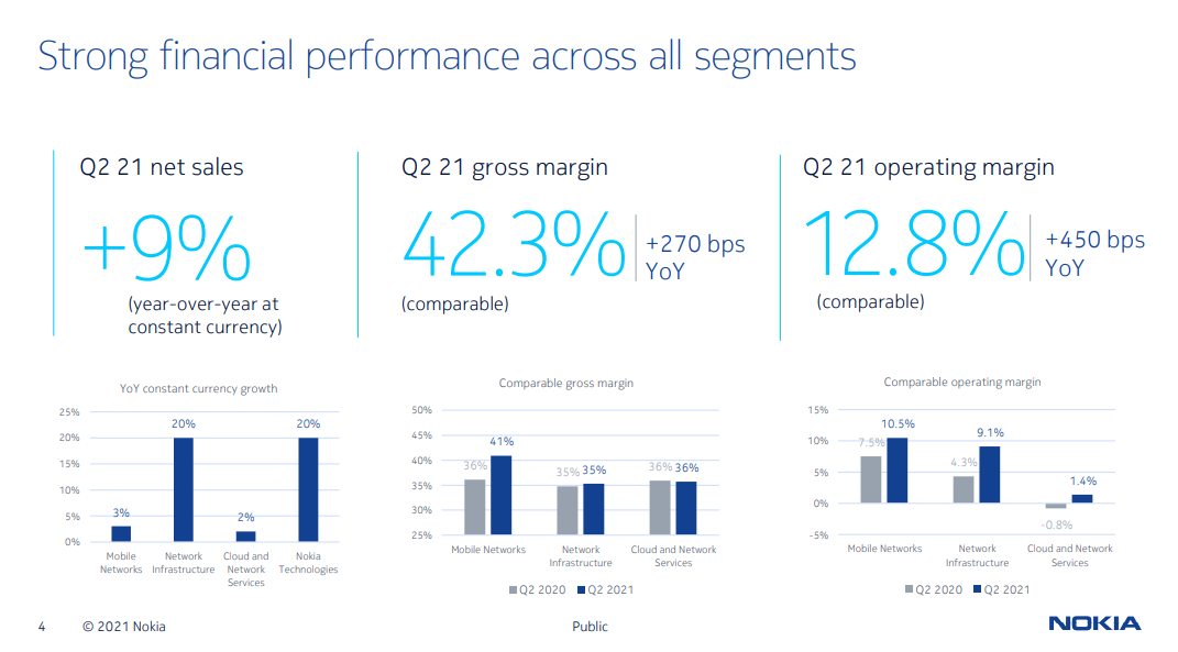 ICC訊(編譯:Vicki)諾基亞公布了其截止至2021年6月30日第二季度的業(yè)績報(bào)告。報(bào)告顯示,該季度諾基亞收入為53.13億歐元,同比增長4%,以constant currency來看營收同比增長9%。凈利潤3.51億歐元,去年同期凈收入9900萬歐元。2021年第二季度的營收保持增長勢頭,這得益于所有業(yè)務(wù)的增長。該季度毛利率為41%,去年同期為38.1%。