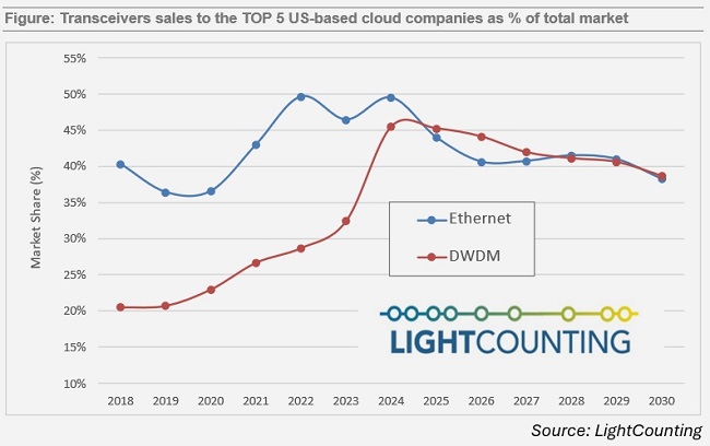 通過(guò)對(duì)亞馬遜、谷歌、Meta、微軟和甲骨文這五家美國(guó)頂級(jí)云公司采購(gòu)以太網(wǎng)和DWDM光模塊的情況分析可以看出,經(jīng)歷十多年穩(wěn)定增長(zhǎng)后,它們?cè)谌蚬饽K市場(chǎng)中的份額將逐步下降。盡管它們?cè)诠饽K上的支出仍會(huì)增加,但增速將落后于全球其他市場(chǎng)。