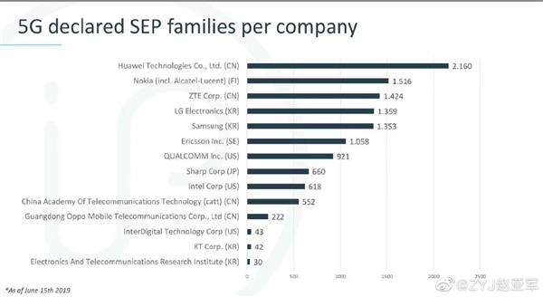 其中華為擁有1554個(gè)5G SEP,諾基亞、三星、LG緊隨其后,另外一家中國(guó)公司中興也擁有1208個(gè)5G SEP,排名第五,比排名第六的高通要了將近50%。