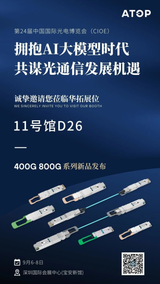 ICC訊 隨著AI大模型時代的到來,算力需求正蓬勃增長,數(shù)據(jù)中心正迎來更廣闊的容量增長與架構(gòu)演進。華拓誠邀您蒞臨第24屆中國國際光電博覽會(CIOE),探討AI大模型時代下的發(fā)展趨勢與機遇。屆時,我們將現(xiàn)場呈現(xiàn)一系列行業(yè)前沿的光模塊產(chǎn)品,包括800G系列新產(chǎn)品、400G產(chǎn)品多平臺方案等,以及數(shù)據(jù)中心解決方案等創(chuàng)新成果。