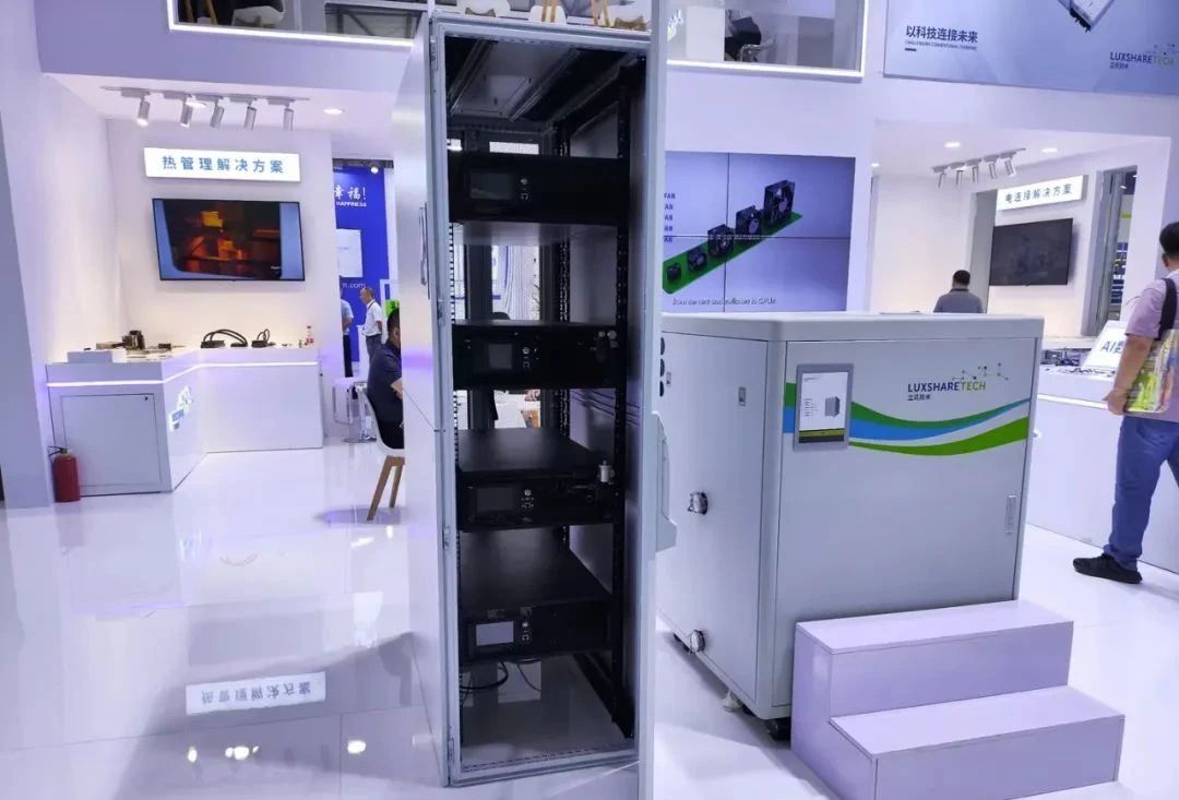 在熱管理這一關(guān)鍵領(lǐng)域,立訊技術(shù)同樣展現(xiàn)了其強(qiáng)大的創(chuàng)新實(shí)力與前瞻視野。展會(huì)現(xiàn)場(chǎng),公司隆重推出了最前沿的堆疊式CDU機(jī)柜和浸沒(méi)式液冷Tank,為高密度、高功耗的AI數(shù)據(jù)中心提供了革命性的散熱解決方案。