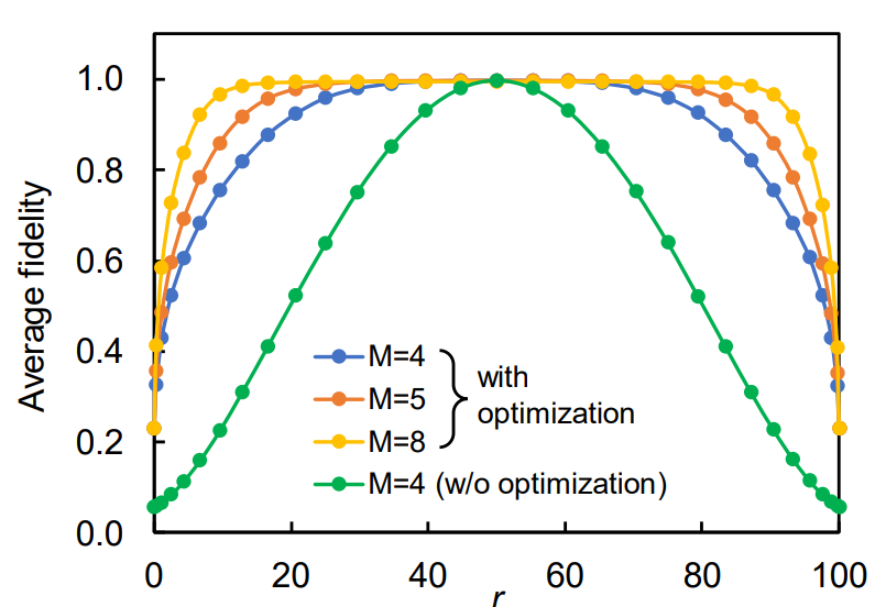 作者對具有不同級數(shù)的 4×4 電路的保真度進(jìn)行了數(shù)值分析,假設(shè)所有相移的控制精度為 0.01 rad,平均分割比為 r:100-r(其中 r 為 0 到 100 之間的變量),標(biāo)準(zhǔn)偏差為 2,目標(biāo)矩陣為 1000 個哈爾隨機(jī)單元矩陣。圖 2 所示的結(jié)果表明,即使不增加階段(M = 4),優(yōu)化后的平均保真度也有顯著提高。增加級數(shù)可進(jìn)一步提高保真度,但級數(shù)越多,插入損耗越大,因此必須為實(shí)際設(shè)備選擇合適的級數(shù)。