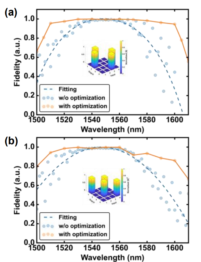 接下來,他們使用自己提出的算法優(yōu)化了多個波長的所有相移,并再次測量了保真度。如圖 4 所示,當(dāng)波長偏離 1.55 μm 時,保真度有所提高,即使電路中沒有增加額外的 MZI 級。作者希望通過增加額外的 MZI 級來進(jìn)一步提高保真度。