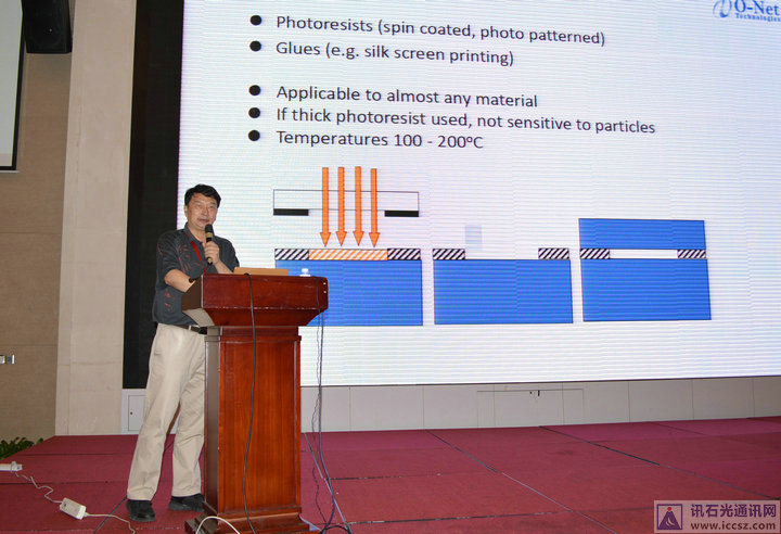 在有關(guān)光通信芯片發(fā)展的演講之后是《光器件封裝發(fā)展趨勢》主題演講,演講者是昂納光通信全球市場推廣副總裁華一敏博士。華博士負(fù)責(zé)監(jiān)管本集團(tuán)光網(wǎng)絡(luò)部之無源光器件、模塊、子系統(tǒng)及放大器,以及自動化及傳感部之激光雷達(dá)(LiDAR)的產(chǎn)品營銷和產(chǎn)品管理,擁有二十幾年行業(yè)經(jīng)驗(yàn)。華博士提到“為什么要探索晶片鍵合過程?”我們的目標(biāo)是將芯片級封裝推向圓片級,第一是減少功能設(shè)備的空間和成本;第二是提高功能器件的可靠性和成本;第三是構(gòu)建新型功能器件。隨后,華博士在演講主要為我們講到晶片鍵合技術(shù)、晶圓鍵合技術(shù)的比較和芯片級封裝是目標(biāo)這幾大部分。