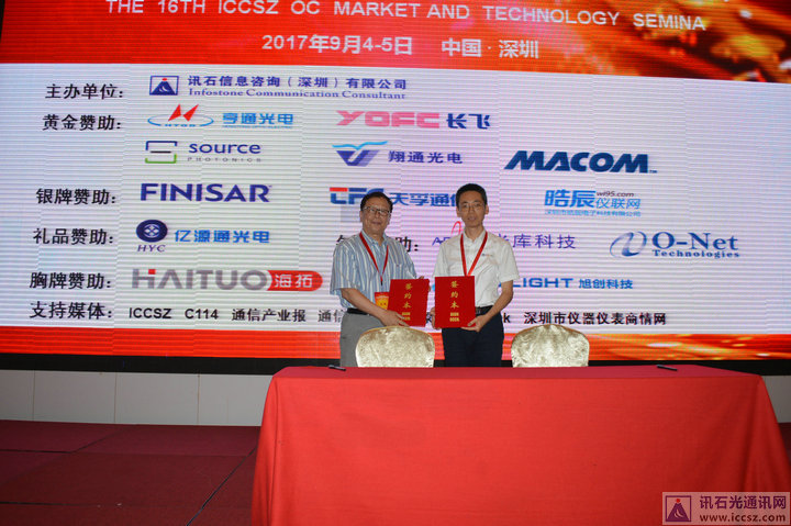 在十位嘉賓的精彩演講中,4號會議漸漸接近接近尾聲,最后環(huán)節(jié)是訊石與陜西光電子集成電路先導(dǎo)技術(shù)研究所(以下簡稱:先導(dǎo)所)的合作簽約儀式。先導(dǎo)所是由中科院西安光機(jī)所聯(lián)合重點(diǎn)高校、科研院所共同發(fā)起的國內(nèi)首家“產(chǎn)-學(xué)-研-資-用-孵”相結(jié)合的光電子集成產(chǎn)業(yè)孵化公共平臺,為項(xiàng)目提供全生命周期的專業(yè)技術(shù)、知識、裝備、專項(xiàng)基金、專業(yè)團(tuán)隊(duì)管理和服務(wù)。而訊石是中國第一家以光通信企業(yè)為對象的專業(yè)化咨詢服務(wù)機(jī)構(gòu)。公司自2001年成立以來,為海內(nèi)外眾多光通信行業(yè)提供行業(yè)預(yù)測、企業(yè)規(guī)劃、市場信息等前瞻性服務(wù)公司現(xiàn)已成為國際化的光通信顧問咨詢權(quán)威機(jī)構(gòu)。
