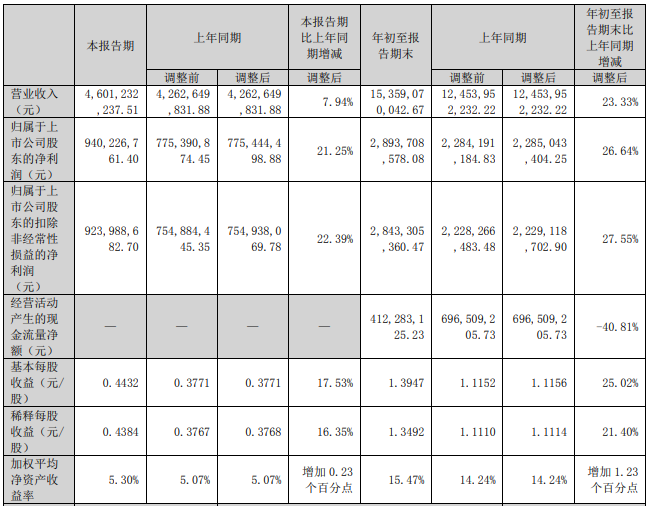 ICC訊 10月25日,中航光電科技股份有限公司(簡稱“中航光電”或“公司”,002179)發(fā)布2023年第三季度報告,前三季度歸屬于母公司所有者的凈利潤28.94億元,同比增長26.64%;營業(yè)收入153.59億元,同比增長23.33%;基本每股收益1.3947元,同比增長25.02%。第三季度歸屬于母公司所有者的凈利潤9.4億元,同比增長21.25%;營業(yè)收入46.01億元,同比增長7.94%。