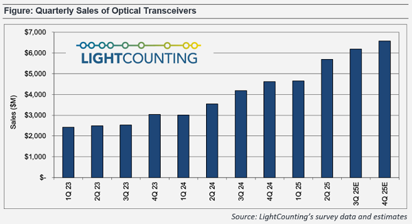 ICC訊——根據(jù)市場研究公司LightCounting(LC)于2025年12月發(fā)布的季度市場更新報告,全球光收發(fā)器(光模塊)及相關(guān)產(chǎn)品市場在2025年迎來前所未有的強(qiáng)勁增長。報告預(yù)計(jì),2025年全年銷售額將超過230億美元,較2024年大幅增長50%。這一增長主要由谷歌母公司Alphabet、亞馬遜、Meta和微軟等超大規(guī)模云服務(wù)提供商創(chuàng)紀(jì)錄的資本支出,以及持續(xù)旺盛的人工智能(AI)基礎(chǔ)設(shè)施需求所驅(qū)動。