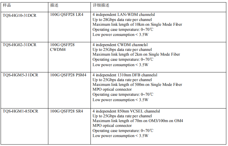 截止目前,泰瑞創(chuàng)擁有多項相關(guān)專利,產(chǎn)品已通過了UL/ FDA/TUV等安規(guī)認(rèn)證,以及ISO9001質(zhì)量管理體系認(rèn)證。產(chǎn)品主要有100G QSFP28,40G QSFP+,10G SFP+,10G XFP, 10G BIDI,Copper, SGMII等。