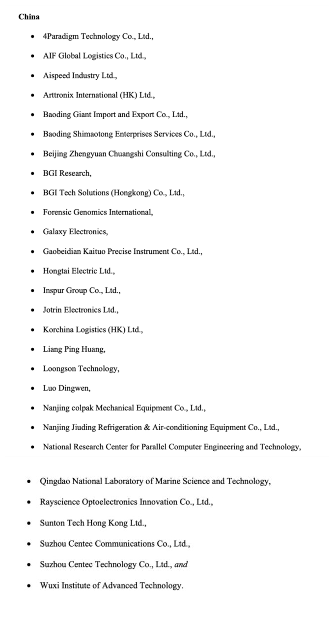 據(jù)悉,本次除了中國大陸地區(qū)的 28 家實(shí)體之外,還包含 1 個(gè)俄羅斯實(shí)體、1 個(gè)白俄羅斯實(shí)體、3 個(gè)緬甸實(shí)體、1 個(gè)中國臺灣的實(shí)體以及 4 個(gè)巴基斯坦實(shí)體。
