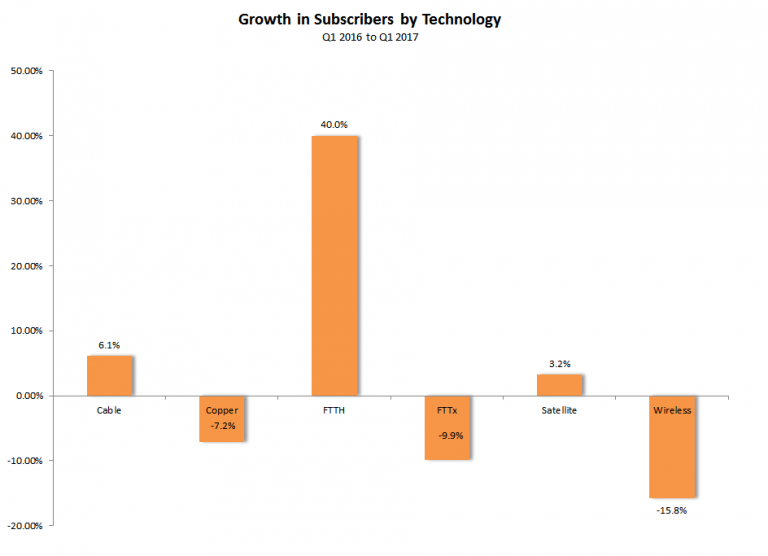 在年度變化方面,全球的銅線數(shù)量下降了7%, 而FTTH用戶數(shù)在2016年第一季度到2017年第一季度之間上升了40% (圖6)。這個數(shù)字與之前一個季度相比略有所下降,但是光纖替代銅線的趨勢依然明顯。FTTX的負(fù)增長主要是由于FTTH在中國大規(guī)模的替代了FTTX.同時(shí),固定的無線技術(shù)在逐漸的給基于4G LTE的移動寬帶接入鋪路。實(shí)際上,在一些國家和地區(qū)這被認(rèn)為是一種提供家庭連接寬帶的方式,例如斯堪的納維亞和東歐。